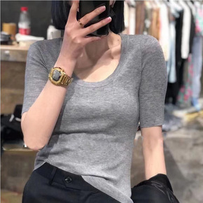 复古气质U领显瘦露锁骨冰丝针织衫薄款女夏短袖打底上...