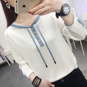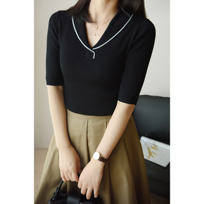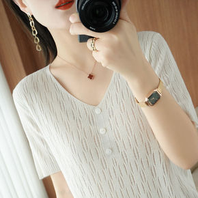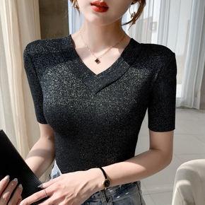 冰丝针织衫女短袖t恤2021年秋装新款v领打底衫紧...