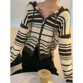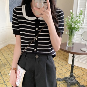 实拍2022韩版小香风条纹娃娃领设计感短袖针织开衫...