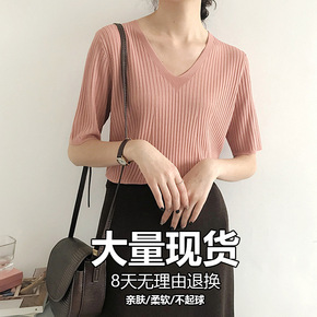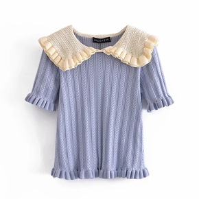 2021新款欧美外贸女装木耳边翻领拼接针织上衣短袖...