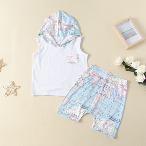 外贸夏季新款男童套装宝蓝色地图印花背心无袖连帽卫衣...