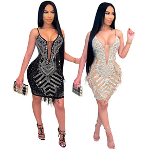 夜场时尚酒吧女装不规则流苏亮片低胸v领紧身包臀吊带...