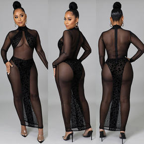 欧美女装亚马逊爆款性感夜店连衣裙透视豹纹植绒拼接晚...