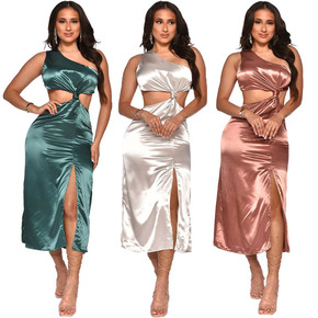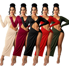 夜店性感分叉连衣裙显瘦低胸束腰时尚短袖连衣裙长裙会...