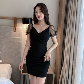 夏秋新款女装夜店性感拼接透视包臀裙洋装深V领短款无...