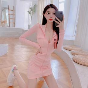 夜店女装性感连帽长袖连衣裙女秋冬上镜主播拉链低胸紧...