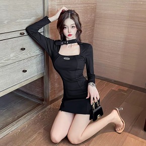2910811夜店性感方领低胸镂空扣带装饰开衩A字...