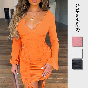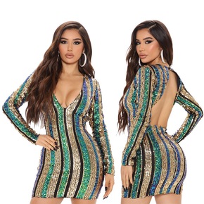 YY6583 欧美跨境新款 V领性感露背长袖包臀...
