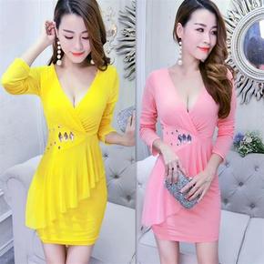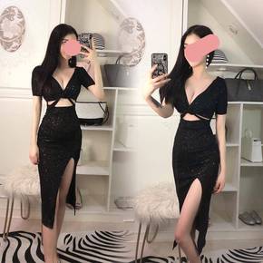 开叉连衣裙夜店性感连衣裙女夜总会气质女神范名媛低胸...