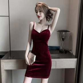 技师工作服夜店性感低胸吊带露背修身丝绒包臀裙夜店...