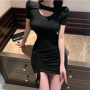 夏季裙子女时尚性感方领短袖褶皱包臀连衣裙缎面丝滑夜...