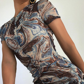 欧美新款女装eBay夜店性感透视网布印花连衣裙褶皱...
