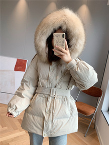 2021韩版羽绒服女短款宽松新款大毛领加厚腰带收腰...