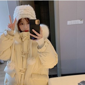 2021连帽白色羽绒棉服女冬中长款小个子仿狐狸毛领...