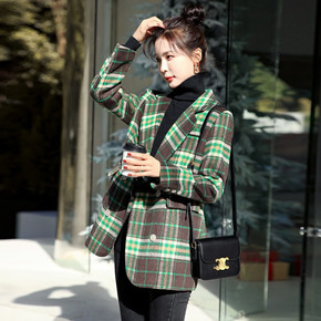 秋冬季中长新款女复古气质格子毛呢子小西装大衣外套夹...