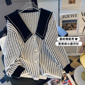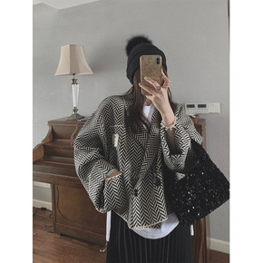 仿水貂绒中长款格子外套韩版宽松针织西装领大衣秋冬新...