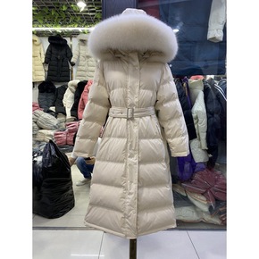 华哥弟情冬季女中长款加厚保暖修身白鸭绒大毛领冬收腰...