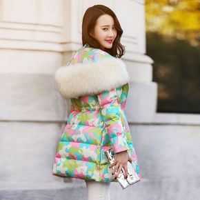 2021冬季新款韩版大毛领迷彩羽绒服女中长款收腰显...