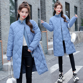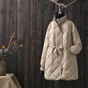 文艺风轻薄立领菱形格羽绒服女中长款系带收腰韩版修身...