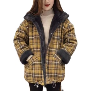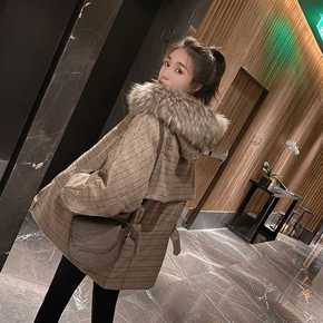 格子毛呢加绒加厚棉服女宽松大码中长款外套小个子冬季...