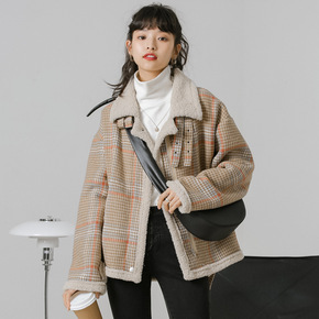 羊羔毛外套女2021秋冬款宽松韩版加厚港风格子翻领...