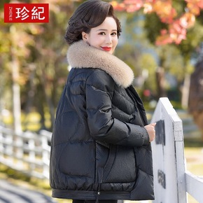 中老年女装冬羽绒服PU皮大毛领短款羽绒服母亲婆婆上...