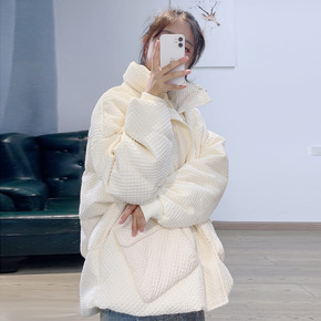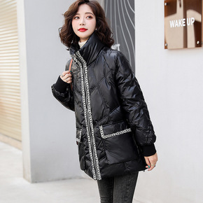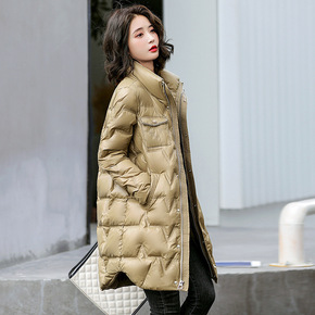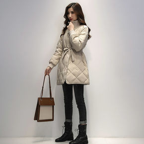 2021新款羽绒服女韩版中长款立领菱形格收腰修身白...