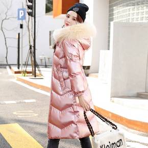 2021冬新款大毛领免洗亮面羽绒棉服女中长款韩版加...