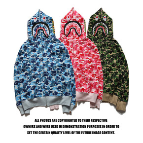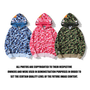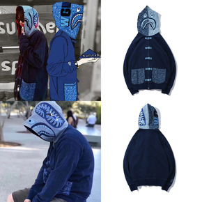 潮牌鲨鱼头猿人头迷彩底纹双帽卫衣男女同款拉链连帽外...