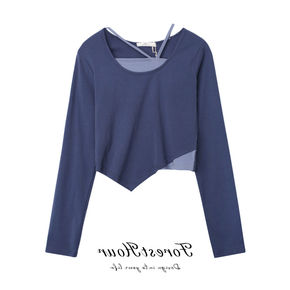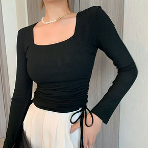 欧货ins方领锁骨t恤女长袖2021秋冬新款洋气打...