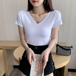 T恤短袖双v领夏季紧身低领设计感女士白色修身显瘦韩...