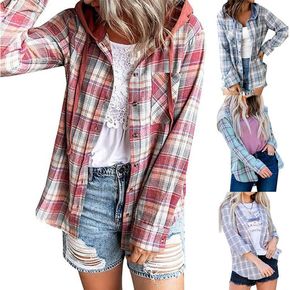 衬衣欧美外贸女装2021秋冬新款亚马逊格子连帽衫单...