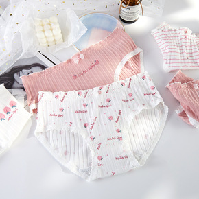 女士内裤批发螺纹棉全棉日系可爱桃子印花清新少女中腰...