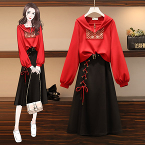大码女装2022春秋新款显瘦微胖妹妹遮肚子红色卫衣...
