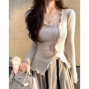 微胖套装微胖 纯欲风木耳边修身针织衫上衣女设计感半...