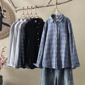 2160韩版港风复古黑白格子双层棉纱衬衣 女文艺宽...
