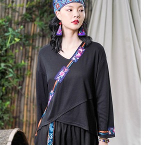 2021秋季新款复古民族风V领刺绣撞色花边长袖女T...