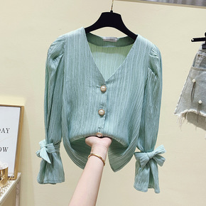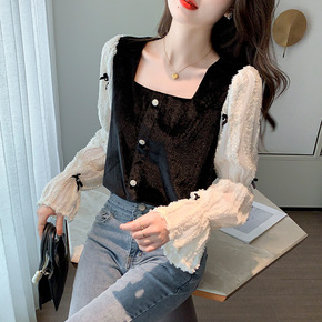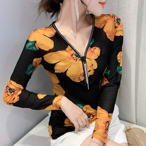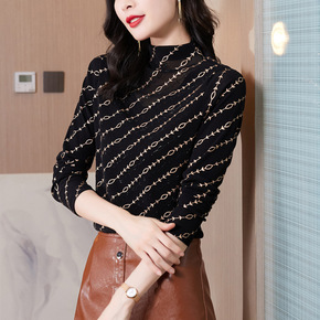 2021秋季新款时尚立领长袖薄纱衣镶钻打底衫女半高...