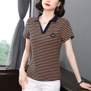 2021夏季新款条纹T恤女短袖POLO领宽松潮搭中...
