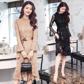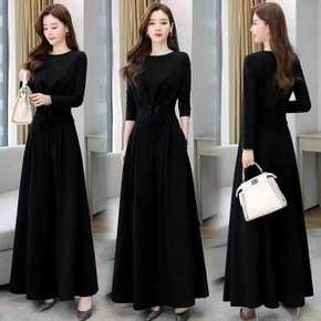 中长款针织打底过膝连衣裙春秋冬款腰带收腰毛衣裙子气...
