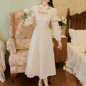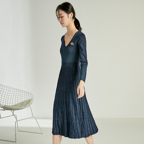 宫廷复古针织连衣裙2021秋季新款女装法式小众V领...