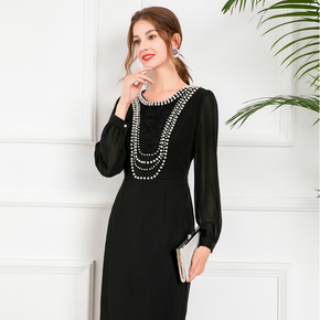 2021年秋季新款女装圆领长袖手工串珍珠中腰修身女...
