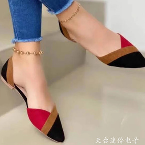 2021跨境外贸新款尖头平底中空单鞋女大码拼色包跟...