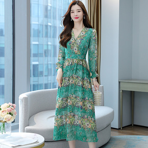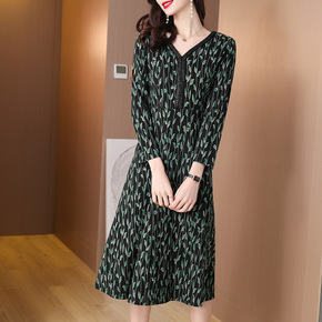 2021秋季新款长袖定位印花桑蚕丝连衣裙女V领收腰...