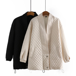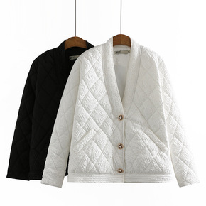 2021秋冬新款轻薄压皱棉服女大码V领黑白显瘦花边...