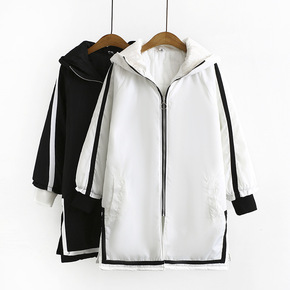 S6大码女装秋冬款胖mm显瘦宽松中长款条纹开叉连帽...