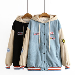 S6大码女装秋冬胖mm显瘦宽松灯芯绒拼色棒球服夹克...