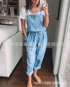 现货wish 速卖通女性牛仔连体裤宽松时尚松紧中腰...