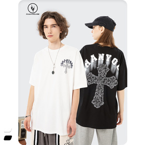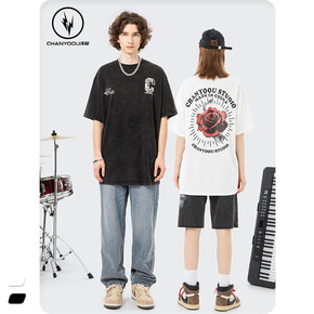 浅耀男装|美式复古玫瑰印花短袖男士国潮洗水做旧夏季...