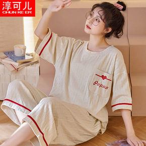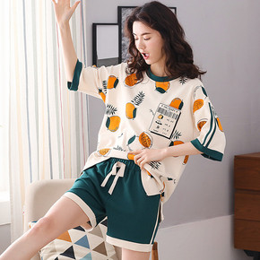 睡衣女士夏季棉质短袖长裤韩版宽松少女家居服夏天可外...